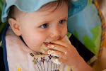 - No, I'm not crawling yet - Daddy keeps trying to bribe me with food & toys but I just mess with him by grabbing something closer so I don't have to work so hard.